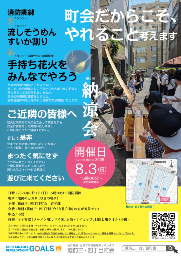 流しそうめん&スイカ割に花火! イベントnow! 2025.08.05 2024.07.19 猛暑の中、たくさんの笑顔があふれる楽しい時間となりました。皆様のご参加ありがとうございました。また、準備から運営まで支えてくださったスタッフの皆さん、本当にお疲れさまでした! 参加してくれる人は次のものを忘れずに持ってきてね! ①そうめんを入れる容器 ②おはし ③ジュースを入れる水筒又はコップ ④スイカ割の時お子様の目隠しタオル ※雨天の場合はこちらでも詳細をお知らせします。